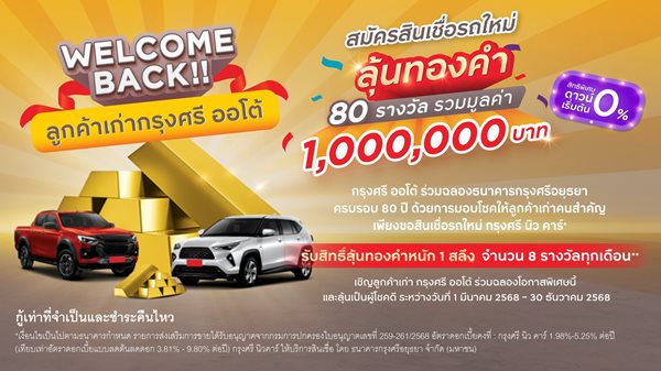 - เฉพาะลูกค้าเก่า กรุงศรี ออโต้ ที่สมัครสินเชื่อ กรุงศรี นิว คาร์ และได้รับอนุมัติเป็นเลขที่สัญญาและรับรถ ระหว่างวันที่ 1 มีนาคม 2568 – 30 ธันวาคม 2568