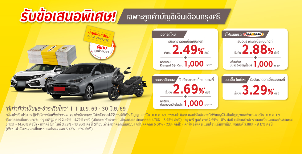 สำหรับลูกค้าบัญชีเงินเดือนกรุงศรี รับดอกเบี้ยและโปรโมชันพิเศษ เมื่อสมัครสินเชื่อกับกรุงศรี ออโต้ ระหว่างวันที่