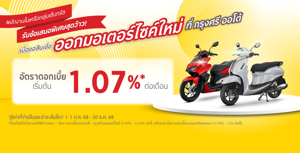 สำหรับคนที่ต้องการบิดรุ่นเล็ก กรุงศรี มอเตอร์ไซค์ พร้อมให้คุณขอสินเชื่อได้สบาย ๆ ผ่านตัวแทนจำหน่ายอย่างเป็นทางการทั่วประเทศ