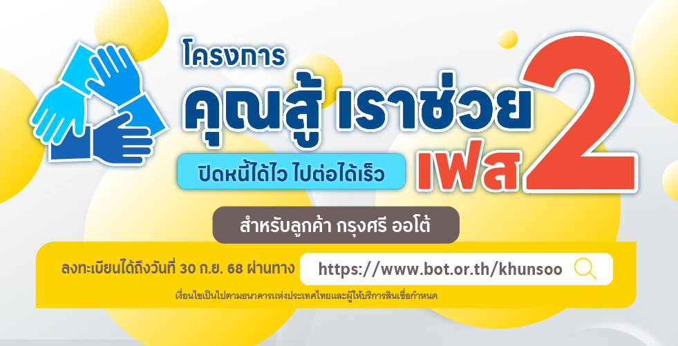| สินเชื่อเช่าซื้อรถยนต์ / จำนำทะเบียนรถยนต์ / รถแลกเงิน (Car for Cash) รถยนต์ | ธนาคารกรุงศรีอยุธยา จำกัด (มหาชน) (BAY) | 02-740-7400 กด 3 |