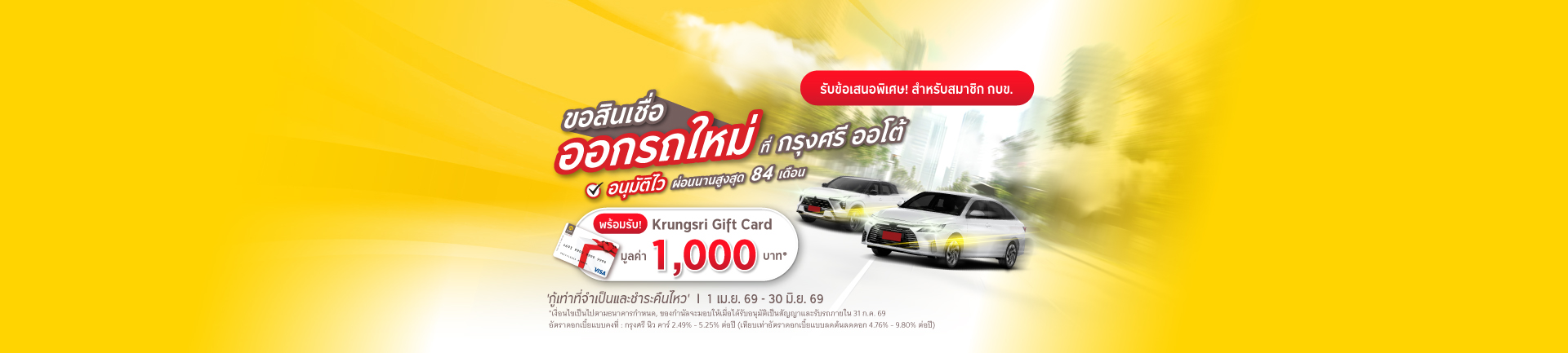 เฉพาะลูกค้าบุคคลธรรมดาที่รับเงินเดือนผ่านธนาคารกรุงศรีอยุธยา สมัครสินเชื่อ กรุงศรี นิว คาร์ สมัครผ่านช่องทางออนไลน์ของกรุงศรี ออโต้ (www.krungsriauto.com, Krungsri Auto PromptStart, LINE Official Account, DLD, Go by Krungsri Auto) ระหว่าง วันที่ 1 เมษายน 2569 – 30 มิถุนายน 2569 และได้รับอนุมัติสินเชื่อเป็นเลขที่สัญญา และรับรถภายใน 31 กรกฎาคม 2569 ได้รับบัตรของขวัญกรุงศรี (Krungsri Gift Card) แทนเงินสดมูลค่า 1,000 บาท ใช้ง่าย ได้ทุกที่ภายใต้สัญลักษณ์ VISA ในประเทศไทย