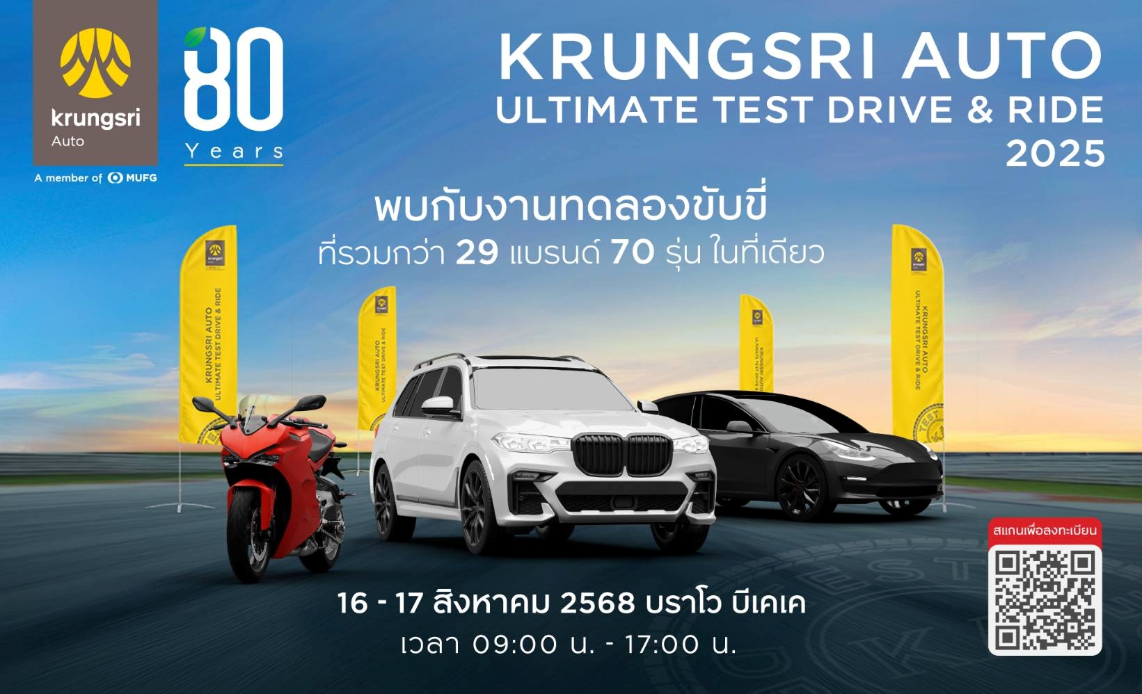 ลูกค้าปัจจุบัน กรุงศรี ออโต้ และผู้ที่สนใจสามารถเข้าร่วมงาน “Krungsri Auto Ultimate Test Drive & Ride 2025” ได้ระหว่างวันที่ 16 - 17 สิงหาคม 2568 เวลา 09:00 – 17:00 น. ณ บราโว บีเคเค (Bravo BKK) โดยสามารถลงทะเบียนเข้าร่วมงานได้ ตั้งแต่วันที่ 30 กรกฎาคม - 13 สิงหาคม 2568 ติดตามรายละเอียดเพิ่มเติมได้ที่ https://www.krungsriauto.com/auto/Promotion/ultimate_testdrive.html
