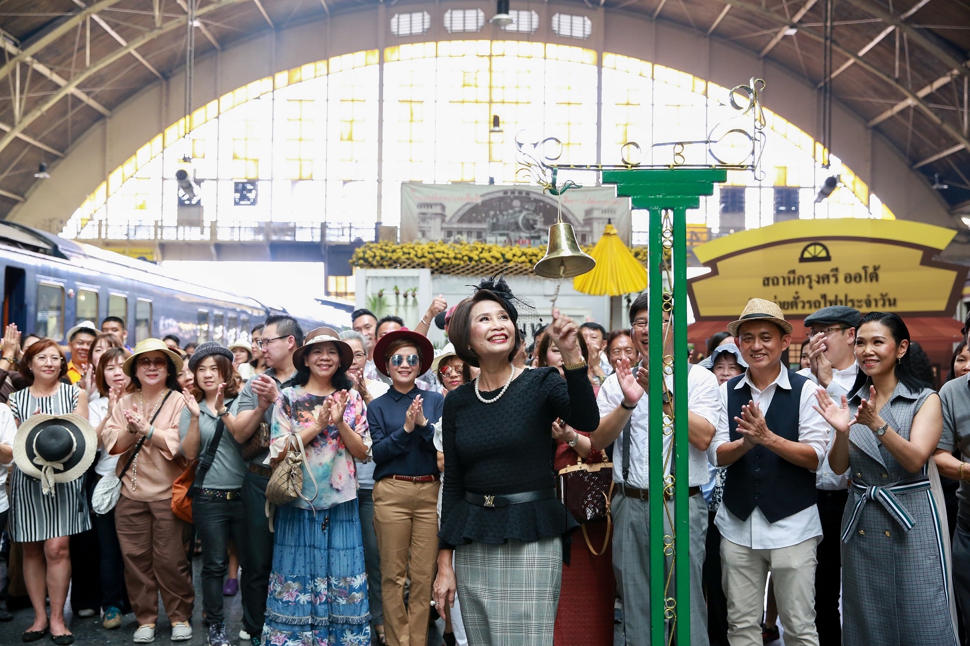 นางกฤติยา ศรีสนิท (กลาง) กรรมการผู้จัดการใหญ่ บริษัท อยุธยา แคปปิตอล ออโต้ ลีส จำกัด (มหาชน) จัดกิจกรรมย้อนอดีตสู่ยุคก่อนร่างสร้างธุรกิจจำหน่ายรถมอเตอร์ไซค์ให้กับผู้แทนจำหน่ายจักรยานยนต์แบรนด์ชั้นนำกว่า 100 รายในกรุงเทพฯ กับทริปสุดเอ็กซ์คลูซีฟ “นั่งรถไฟไปเมืองกาญฯ ย้อนวันวานไปกับกรุงศรี ออโต้” ผ่านการเดินทางสุดคลาสสิคด้วยรถไฟขบวนพิเศษ ตามเส้นทางประวัติศาสตร์จากกรุงเทพฯ – กาญจนบุรี พร้อมเพลิดเพลินกับเกร็ดความรู้รถไฟไทยตลอดขบวน