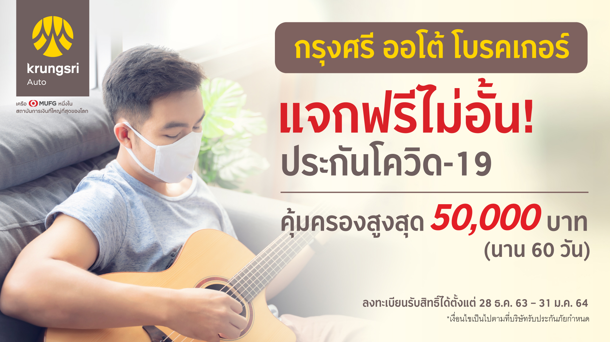 กรุงศรี ออโต้ โบรคเกอร์ ส่งต่อความห่วงใย มอบฟรี ประกันอุ่นใจ คุ้มภัย COVID-19 ผ่านเว็บไซต์ Krungsri Auto Broker ด้วยระยะเวลาคุ้มครองนาน 60 วัน พร้อมวงเงินคุ้มครองสูงสุด 50,000 บาท เมื่อตรวจพบภาวะ*จากโรคติดเชื้อไวรัสโคโรนาสายพันธุ์ใหม่ 2019 (COVID-19) และค่าชดเชยรายวันกรณีการรักษาพยาบาลผู้ป่วยใน 500 บาทต่อวัน สูงสุดไม่เกิน 15 วัน เคียงข้างดูแลและช่วยลดภาระค่าใช้จ่ายด้านสุขภาพ ให้ทุกชีวิตเดินหน้าต่ออย่างอุ่นใจในทุกสถานการณ์ รับประกันภัยโดย บมจ. ซิกน่า ประกันภัย