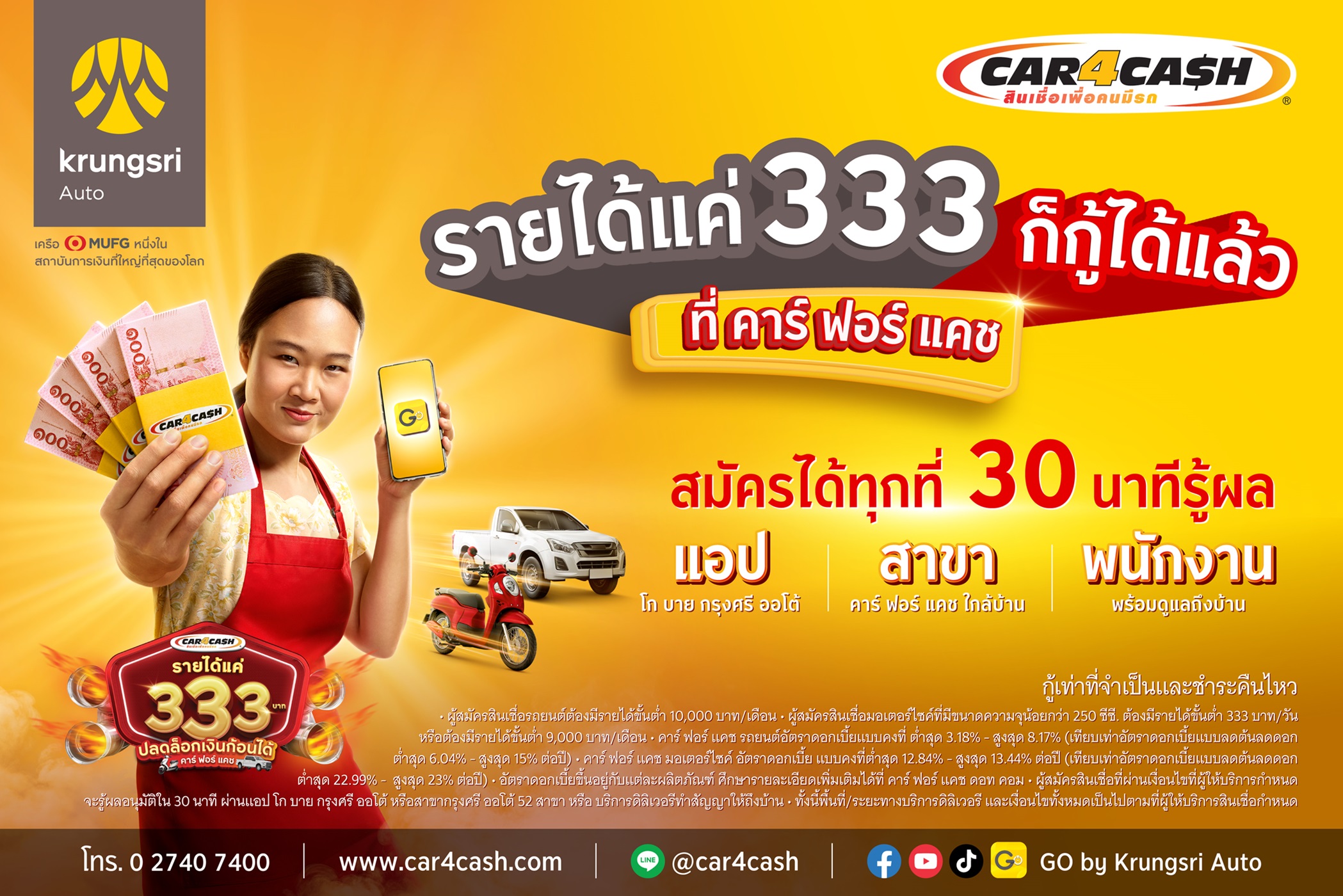 ‘คาร์ ฟอร์ แคช’ ผู้นำตลาดสินเชื่อเพื่อคนมีรถ เพิ่มโอกาสในการเข้าถึงบริการทางการเงิน ตอบโจทย์กลุ่มเจ้าของรถยนต์และมอเตอร์ไซค์ ที่เป็นพนักงานรายวันหรือประกอบอาชีพอิสระ กับสินเชื่อเพื่อคนมีรถ เพื่อเสริมสภาพคล่อง จัดการรายจ่ายที่ไม่คาดคิด พร้อมรู้ผลอนุมัติไวภายใน 30 นาที ที่แอป โก บาย กรุงศรี ออโต้ (GO by Krungsri Auto Application) โดยยังมีรถไว้ใช้ในชีวิตประจำวันต่อยอดอาชีพได้เหมือนเดิม ด้วยข้อเสนอสำหรับเจ้าของมอเตอร์ไซค์ รายได้เริ่มต้นที่ 333 บาท/วัน และมีรายได้สม่ำเสมอเริ่มต้นที่ 9,000 บาท/เดือน* เจ้าของรถยนต์รายได้เริ่มต้นที่ 334 บาท/วัน หรือรายได้สม่ำเสมอเริ่มต้นที่ 10,000 บาท/เดือน ตามแนวทางการให้สินเชื่ออย่างรับผิดชอบและเป็นธรรม