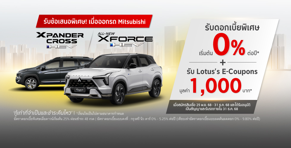 - เฉพาะลูกค้าบุคคลธรรมดาที่สมัครสินเชื่อ กรุงศรี นิว คาร์ รถยนต์รุ่น All – New Mitsubishi XFORCE HEV และ XPANDER HEV ผ่านช่องทางออนไลน์ของ กรุงศรี ออโต้ (www.krungsriauto.com, Krungsri Auto PromptStart, LINE Official Account, Facebook) ระหว่างวันที่ 25 พฤศจิกายน 2568 – 30 ธันวาคม 2568 และได้รับอนุมัติสินเชื่อเป็นเลขที่สัญญา และรับรถภายใน 31 ธันวาคม 2568