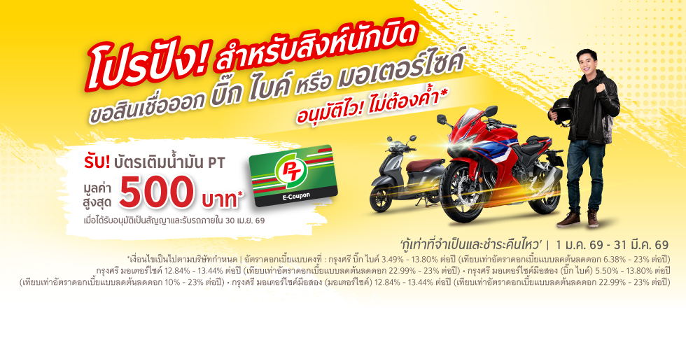 เฉพาะลูกค้าบุคคลธรรมดา ที่สมัครสินเชื่อกรุงศรี มอเตอร์ไซค์ (สำหรับรถบิ๊กไบค์ มอเตอร์ไซค์ และรถจักรยานยนต์ไฟฟ้า) และ กรุงศรี มอเตอร์ไซค์มือสอง (สำหรับรถบิ๊กไบค์ มอเตอร์ไซค์) ผ่านช่องทางออนไลน์ของ กรุงศรี ออโต้ทุกช่องทาง* ระหว่างวันที่ 1 มกราคม 2569 – 31 มีนาคม 2569 และได้รับการอนุมัติเป็นเลขที่สัญญาและรับรถภายในวันที่ 30 เมษายน 2569 เท่านั้น