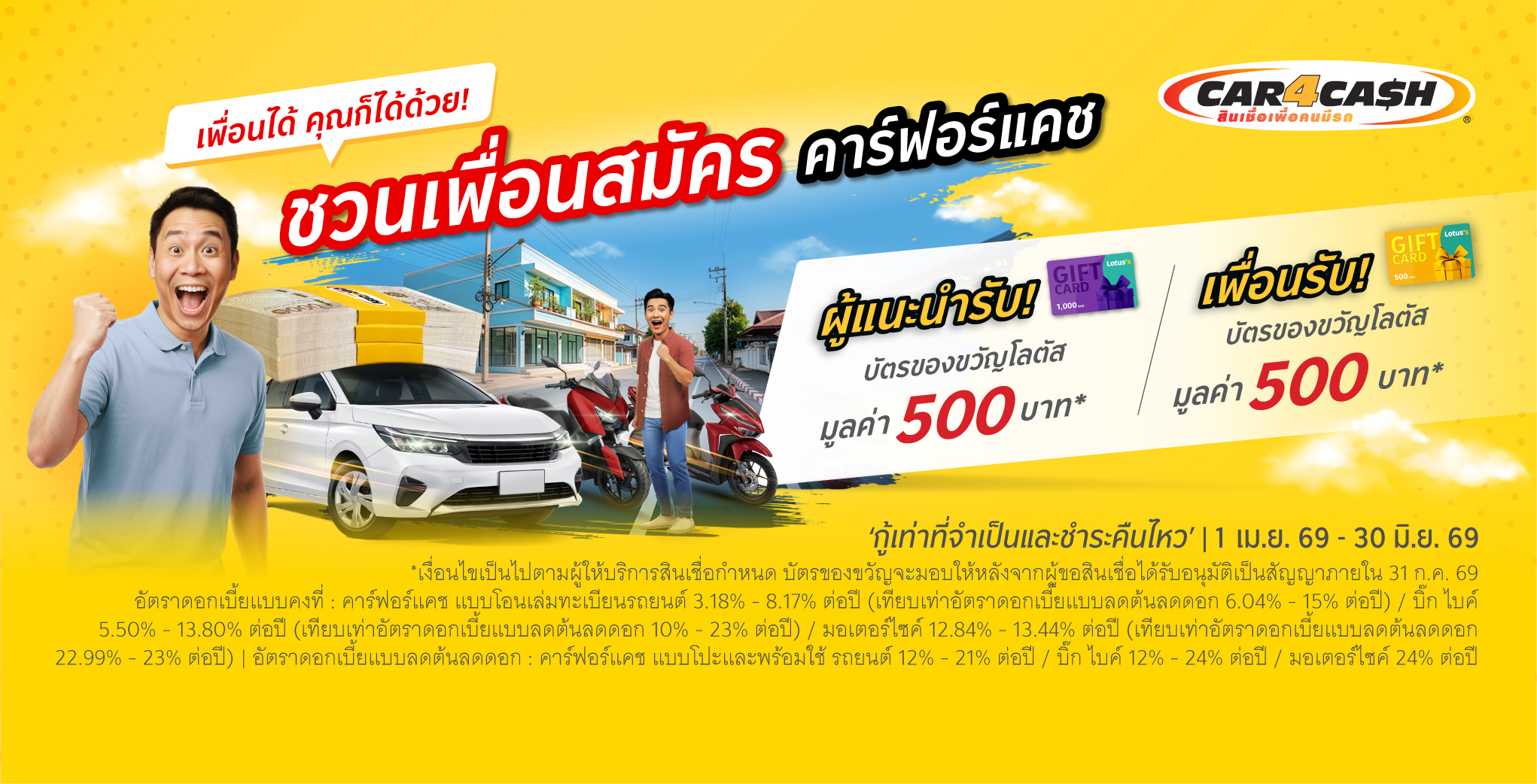 - ผู้ที่ถูกแนะนำ เฉพาะสินเชื่อที่ได้รับอนุมัติวงเงินมากกว่าหรือเท่ากับ 200,000 บาท สำหรับรถยนต์, 20,000 บาท สำหรับรถมอเตอร์ไซค์และ 50,000 บาทสำหรับรถบิ๊กไบค์ จะได้รับบัตรของขวัญโลตัสมูลค่า 500 บาท