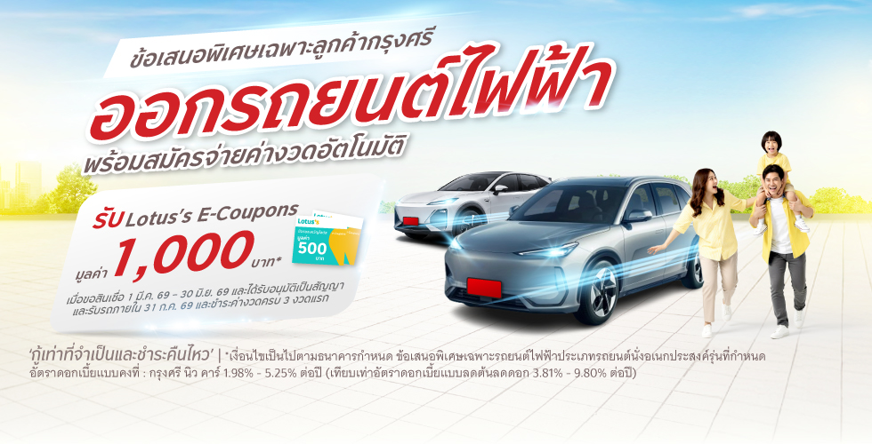 - เฉพาะลูกค้าทุกผลิตภัณฑ์ของธนาคารกรุงศรีอยุธยา สมัครสินเชื่อ กรุงศรี นิว คาร์ สำหรับรถยนต์ไฟฟ้า ประเภทรถยนต์นั่งอเนกประสงค์รุ่นที่กำหนด* ระหว่างวันที่ 1 มีนาคม 2569 – 30 มิถุนายน 2569 เมื่อได้รับอนุมัติสินเชื่อเป็นเลขที่สัญญาและรับรถภายใน 31 กรกฎาคม และชำระค่างวดครบ 3 งวดแรก ผ่านบริการหักบัญชีเงินฝากอัตโนมัติของธนาคารกรุงศรีอยุธยา (Krungsri Autopay Debit) เท่านั้น