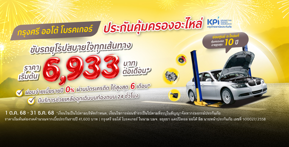 - กรุงศรี ออโต้ โบรคเกอร์ ในนามของ บริษัท อยุธยา แคปปิตอล ออโต้ ลีส จำกัด (มหาชน) เป็นเพียงนายหน้าประกันวินาศภัยเท่านั้น ใบอนุญาตเลขที่ ว00027/2558 การรับประกันภัยเป็นไปตามเงื่อนไขและหลักเกณฑ์ที่บริษัทประกันภัยกำหนด ผู้ซื้อควรทำความเข้าใจในรายละเอียด ความคุ้มครอง และเงื่อนไขก่อนตัดสินใจทำประกันภัยทุกครั้ง