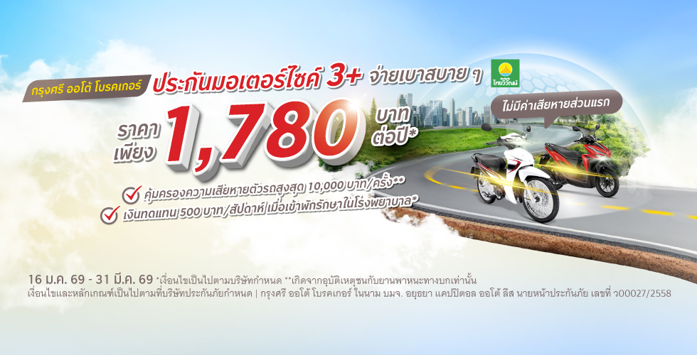 - ประกันชั้นรถมอเตอร์ไซค์ชั้น 3+ ราคาเพียง 1,780 บาท*