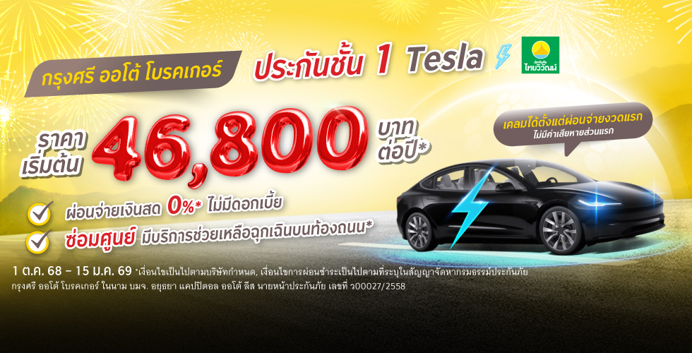คุ้มครองถูกใจ ประกันชั้น 1 TESLA ราคาเริ่มต้น 46,800 บาท/ปี โดยบริษัท ประกันภัยไทยวิวัฒน์ จำกัด (มหาชน)