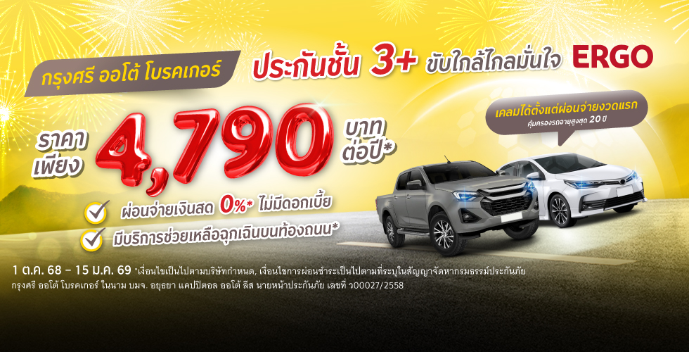 ประกันภัยชั้น 3+ ราคาสบาย ขับใกล้ไกลมั่นใจ ราคาเพียง 4,790 บาท ต่อปี โดยบริษัท เออร์โกประกันภัย (ประเทศไทย) จำกัด (มหาชน)