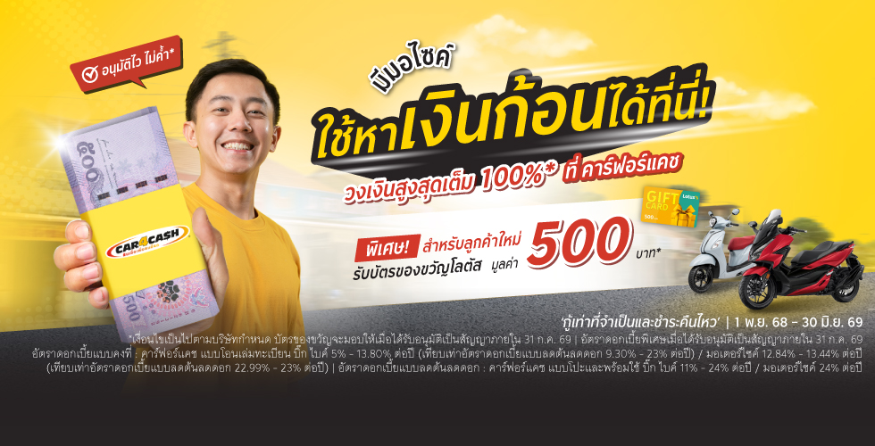 - สำหรับลูกค้าใหม่สมัครสินเชื่อ คาร์ ฟอร์ แคช ทั้งบิ๊ก ไบค์ และมอเตอร์ไซค์ ในระหว่าง 1 ม.ค.69 - 30 มิ.ย.69 อนุมัติเป็นสัญญาภายใน 31 ก.ค. 69