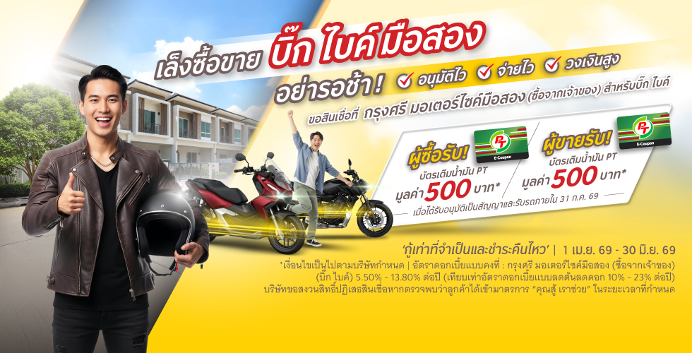 - ขอสงวนสิทธิ์สำหรับลูกค้า (ผู้ซื้อ) ที่สมัครสินเชื่อกับ กรุงศรี มอเตอร์ไซค์ มือสอง (แบบซื้อขายกันเอง) สำหรับรถบิ๊กไบค์ ผ่านช่องทางปกติ (สาขากรุงศรี ออโต้) และ ช่องทางออนไลน์ ของกรุงศรี ออโต้ ระหว่างวันที่ 1 เมษายน 2569 – 30 มิถุนายน 2569 พร้อมอนุมัติเป็นเลขที่สัญญาและรับรถ ภายในวันที่ 31 กรกฎาคม 2569 เท่านั้น