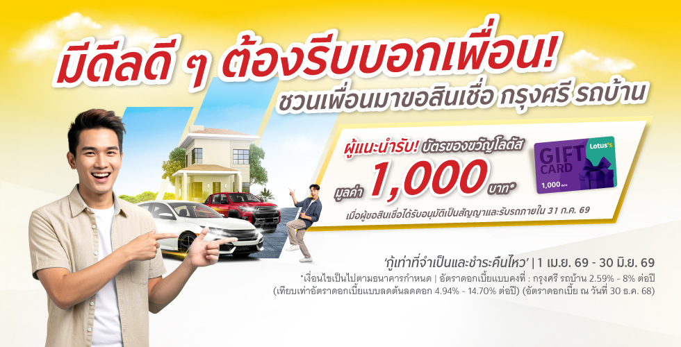 ลูกค้า กรุงศรี ออโต้ แค่บอกต่อก็รับง่ายๆ เพียงชวนเพื่อนมาสมัครสินเชื่อกับ กรุงศรี รถบ้าน