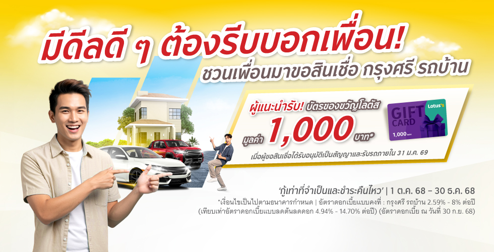 ชวนกันไปสมัครได้ที่ กรุงศรี ออโต้ ทุกสาขาทั่วประเทศ ตั้งแต่วันที่ 1 ตุลาคม 2568 - 30 ธันวาคม 2568