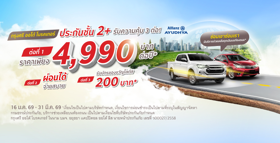 ซ่อมเขาซ่อมเรา ในราคาเบา ๆ ประกันภัยชั้น 2+ ราคาเพียง 4,990 บาท โดย บริษัท อลิอันซ์ อยุธยา ประกันภัย จำกัด (มหาชน)