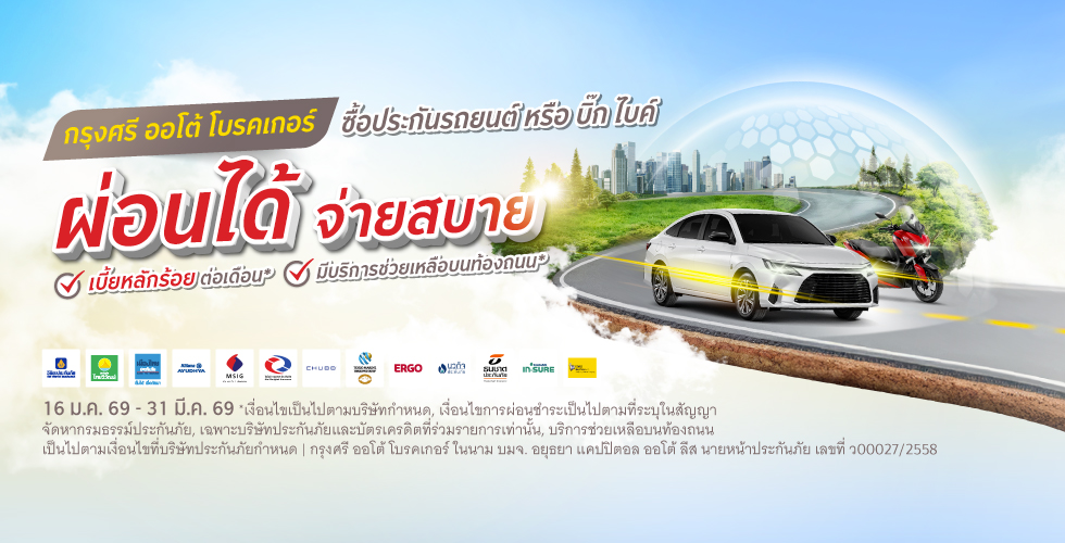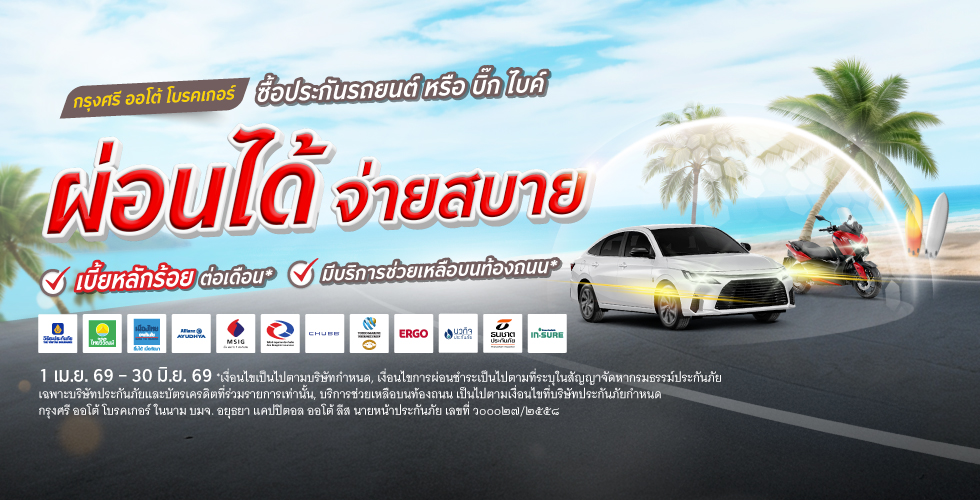 - กรุงศรี ออโต้ โบรคเกอร์ ในนามของ บริษัท อยุธยา แคปปิตอล ออโต้ ลีส จำกัด (มหาชน) เป็นเพียงนายหน้าประกันวินาศภัยเท่านั้น ใบอนุญาตเลขที่ ว00027/2558 การรับประกันภัยเป็นไปตามเงื่อนไขและหลักเกณฑ์ที่บริษัทประกันภัยกำหนด ผู้ซื้อควรทำความเข้าใจในรายละเอียด ความคุ้มครองและเงื่อนไขก่อนตัดสินใจทำประกันภัยทุกครั้ง