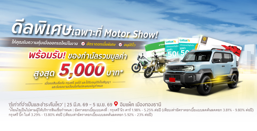 รับสิทธิพิเศษมากมาย มูลค่าสูงถึง 5,000 บาท เมื่อสมัครสินเชื่อ กรุงศรี นิว คาร์ ระหว่างวันที่ 25 มีนาคม 2569 – 5 เมษายน 2569 และได้รับอนุมัติเป็นเลขที่สัญญาและรับรถภายในวันที่ 30 มิถุนายน 2569 รับสิทธิพิเศษหลายต่อ