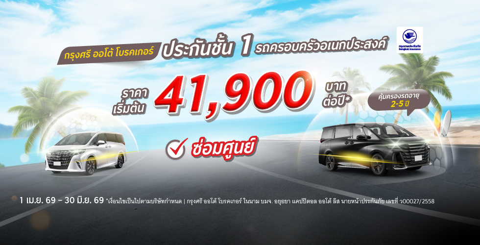 - ระยะเวลาส่งเสริมการขาย 1 เม.ย.69 – 30 มิ.ย 69 ผ่านช่องทางเว็บไซต์ กรุงศรี ออโต้ โบรคเกอร์ (www.krungsriautobroker.com) รวมถึงซื้อผ่านช่องทาง LINE Official Account @krungsriautobroker สาขากรุงศรี ออโต้ จุดรับสมัครบัตรเครดิตและสินเชื่อในโฮมโปร และ ศูนย์บริการกรุงศรีเฟิร์สช้อยส์ ที่ขายประกันรถเท่านั้น