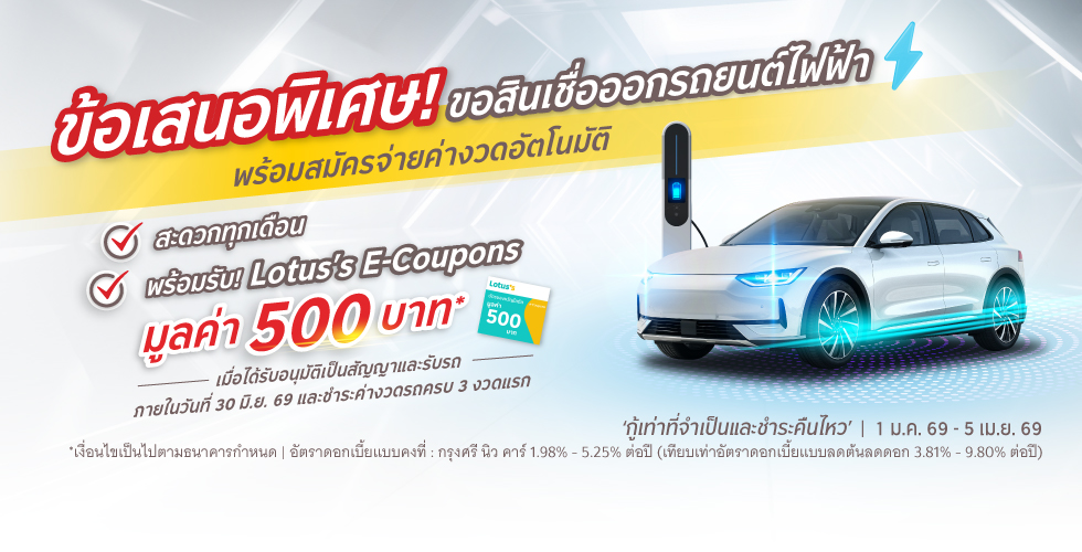 - ลูกค้าบุคคลธรรมดาที่สมัครสินเชื่อสำหรับรถยนต์ไฟฟ้า กรุงศรี นิว คาร์ ผ่านทุกช่องทางออนไลน์ของ กรุงศรี ออโต้ (Krungsri Auto PromptStart, www.krungsriauto.com, LINE, Facebook และ แอปพลิเคชัน GO by Krungsri Auto) ระหว่างวันที่ 1 มกราคม 2569 – 5 เมษายน 2569 เมื่อได้รับอนุมัติเป็นสัญญาและรับรถภายใน 30 มิถุนายน 2569 และชำระค่างวดครบ 3 งวดแรก ผ่านบริการหักบัญชีเงินฝากอัตโนมัติของธนาคารกรุงศรีอยุธยา