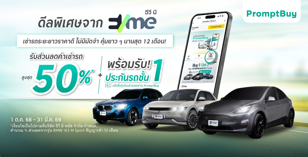 - รุ่นรถที่ให้บริการใน EVme เช่ารถระยะยาวสูงสุด 12 เดือน ได้แก่ MG ZS EV X, MG4 Electric X, GMW ORA Good Cat 500 Ultra, GWM ORA 07 PERFORMANCE, BYD Dolphin EXT RANGE, BYD ATTO3 Extended Range, BYD Seal Premium, AION Y Plus 490 Premium, Hyundai IONIQ 5, Changan Deepal L07, Changan Deepal S07, XPENG G6 Long Range, Mini SE, MG CYBERSTER AWD X, MG MAXUS 9 X, Tesla Model 3 Standard Range (TH/HK/UK version), Tesla Model 3 Long Range (TH/HK/UK version), Tesla Model 3 Performance (TH/HK/UK version), Tesla Model 3 Standard Range (High-Land), Tesla Model 3 Long Range (High-Land), Tesla Model Y Standard Range (TH/HK/UK version), Tesla Model Y Long Range(TH/HK/UK version), Volvo XC40 Recharge Pure EV, Volvo EX30 Ultra Twin Motor Performance, Volvo C40 Recharge Pure Electric, Ford Mustang MACH-E Premium Standard RWD, Ford Mustang MACH-E Premium Extended AWD, BMW iX3 M Sport, BMW i4 eDrive35, BMW i4 eDrive40 M Sport, BMW i4 M50, BMW iX xDrive40, BMW i7, Audi e-tron Sportback 55 quattro S Line