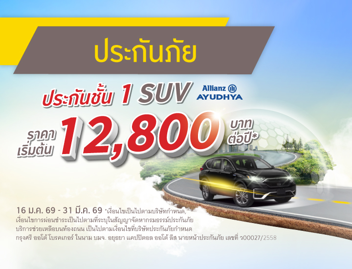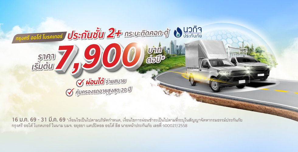 - ระยะเวลาส่งเสริมการขาย 16 ม.ค. 69 - 31 มี.ค. 69 ผ่านช่องทางเว็บไซต์ กรุงศรี ออโต้ โบรคเกอร์ (www.krungsriautobroker.com) รวมถึงซื้อผ่านช่องทาง LINE Official Account @krungsriautobroker สาขากรุงศรี ออโต้ จุดรับสมัครบัตรเครดิตและสินเชื่อในโฮมโปร และ ศูนย์บริการกรุงศรีเฟิร์สช้อยส์ ที่ขายประกันรถเท่านั้น
