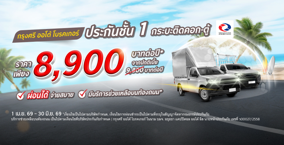 - ระยะเวลาส่งเสริมการขาย 1 เมษายน 2569 – 30 มิถุนายน 2569 ผ่านช่องทางเว็บไซต์ กรุงศรี ออโต้ โบรคเกอร์ (www.krungsriautobroker.com) รวมถึงซื้อผ่านช่องทาง LINE Official Account @krungsriautobroker สาขากรุงศรี ออโต้ จุดรับสมัครบัตรเครดิตและสินเชื่อในโฮมโปร และ ศูนย์บริการกรุงศรีเฟิร์สช้อยส์ ที่ขายประกันรถเท่านั้น