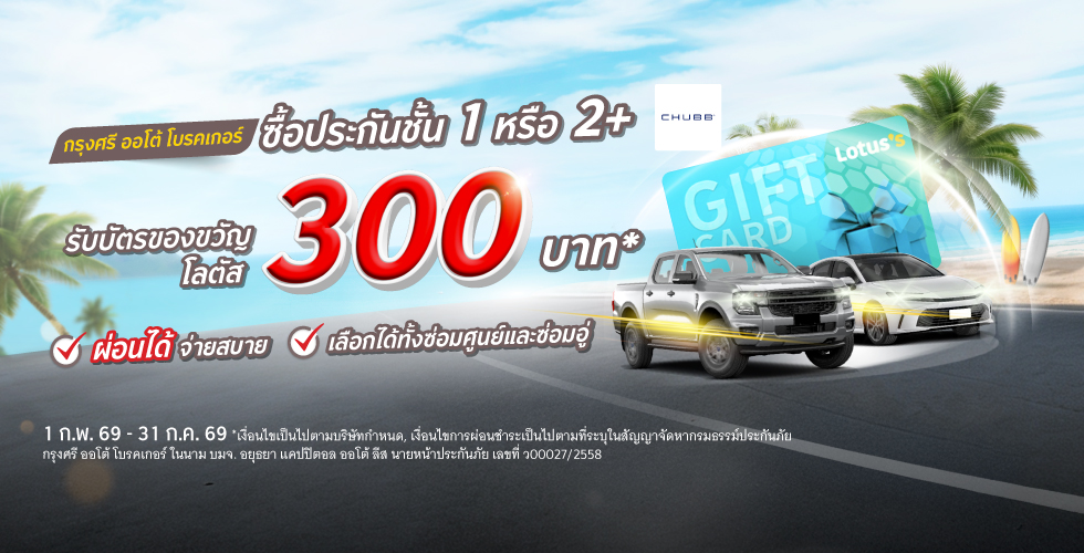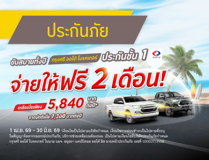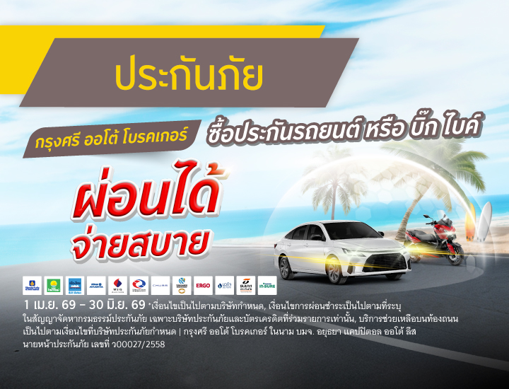- ระยะเวลาส่งเสริมการขาย 1 ก.พ. 69 – 31 ก.ค. 69 ผ่านช่องทางเว็บไซต์ กรุงศรี ออโต้ โบรคเกอร์ (www.krungsriautobroker.com) รวมถึงซื้อผ่านช่องทาง LINE Official Account @krungsriautobroker สาขากรุงศรี ออโต้ จุดรับสมัครบัตรเครดิตและสินเชื่อในโฮมโปร และ ศูนย์บริการกรุงศรีเฟิร์สช้อยส์ ที่ขายประกันรถเท่านั้น