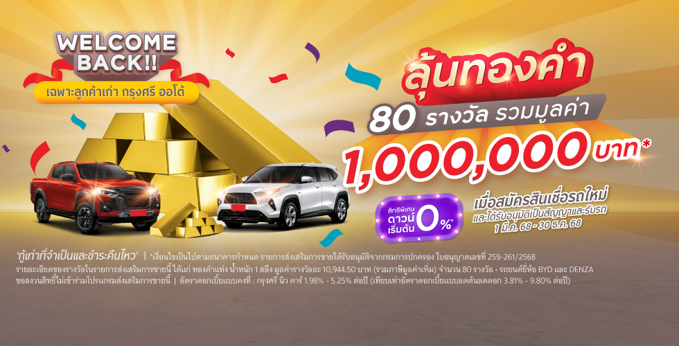 - เฉพาะลูกค้าเก่า กรุงศรี ออโต้ ที่สมัครสินเชื่อ กรุงศรี นิว คาร์ และได้รับอนุมัติเป็นเลขที่สัญญาและรับรถ ระหว่างวันที่ 1 มีนาคม 2568 – 30 ธันวาคม 2568